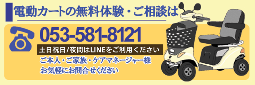 電動カート・セニアカー(シニアカー)・電動車いす。各商品の無料試乗が可能です。出張可能エリア:浜松市・磐田市・袋井市・掛川市・森町。新車購入・中古・バッテリー・修理のご相談もお気軽にご連絡下さい。