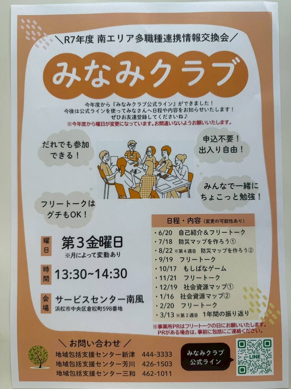 みなみクラブの公式ラインもありますのでこちらでご紹介させていただきます。こちらのチラシのQRコードをスマホのカメラでかざしてご登録お願いします。
