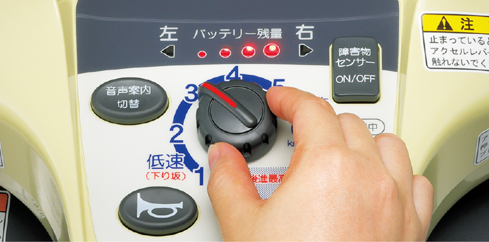 またスズキの新型セニアカーは自動減速センサーが内蔵されていますので前方や側面に障害物が接近すると感知し警告音をならし自動で減速してくれます