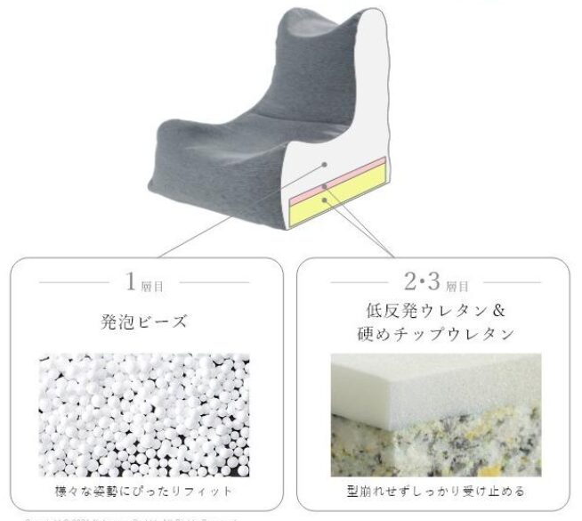 この複合構造により長時間の座位・寝位でも「包まれる感触」「姿勢指示」「疲れ軽減」が意図されています。